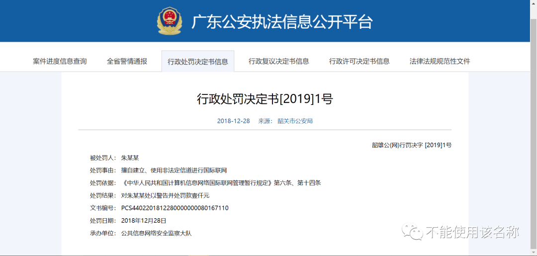 广东公安执法信息公开平台行政处罚决定书信息 韶雄公(网)行罚决字 [2019]1号